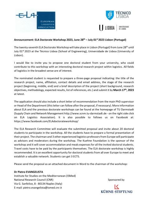 The call for papers of the twenty-seventh edition of the ELA Doctorate Workshop was sent out by Prof. Hans-Christian Pfohl on behalf of the ELA Research committee on late November 2022. It was disseminated in the local logistics research communities and networks by the committee members with a first deadline fixed on 28th February 2023 that was extend until 17th March 2023. On 18th April 2023, the ELA Research committee selected 20 students during the committee meeting held online on Zoom platform. One student that declined to participate was subsequently replaced by another student. Here is the distribution of the participating students by the country of their university.