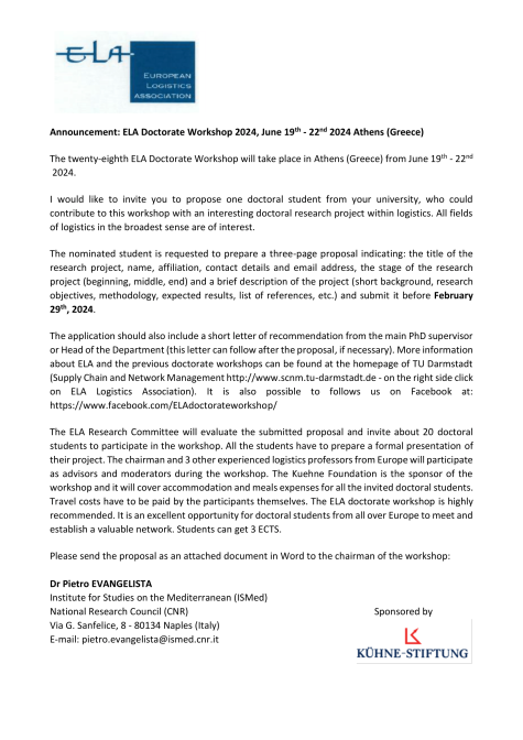 The 28th edition of the ELA Doctorate Workshop proved to be a resounding success, continuing its rich tradition of fostering academic excellence and knowledge exchange in the logistics and supply chain research community. Hosted by the Athens University of Economics and Business (AUEB) and generously sponsored by the Kuehne Foundation, the workshop brought together PhD students, moderators, and keynote speakers from across Europe and beyond.