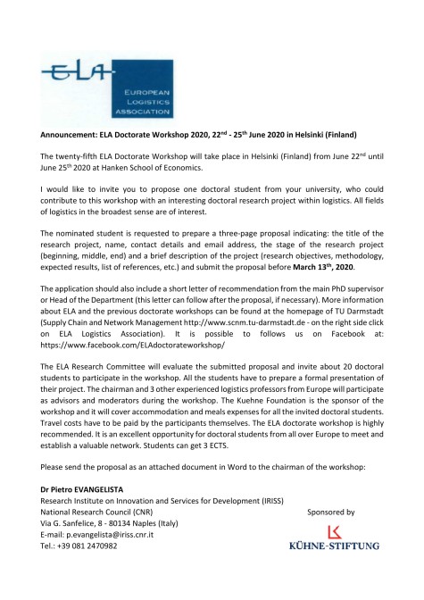 The selection of PhD students was decided during a meeting of the ELA Research & Development Committee. The Committee members assessed the research proposals submitted in a form of a 3-page abstract. Four academics with a research interest in logistics and supply chain acted as moderators during the event. The event was chaired and organised by Dr Michael Bourlakis (Brunel University Business School, UK) and the other three moderators were Prof. Dr. Michael Essig (Bundeswehr University, Germany), Dr. Tom Van Woensel (Technische Universiteit, Netherlands) and Dr Allan Woodburn (Westminster University, UK).